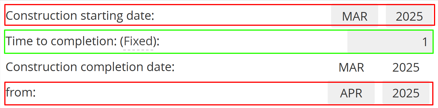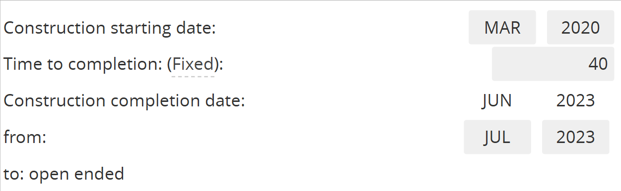 Enter the Construction starting date in [month] and [year] and the Time to completion in the amount of months it took.