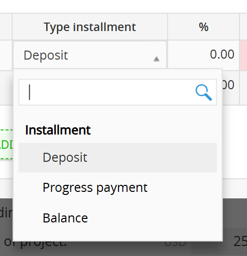Installment Types: You can add a Deposit, Progress payment, or the final Balance. For each, define the Term (e.g., Before, Current period, or After completion).