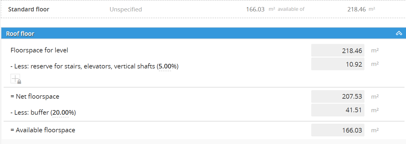 Reserve for stairs, elevators, vertical shafts (5.00%): DC automatically "eats" 5% of your space for the things that let people move between floors.