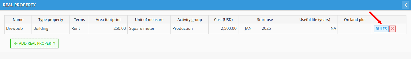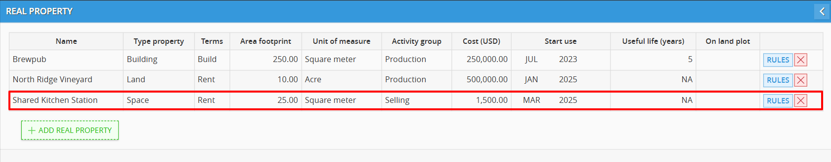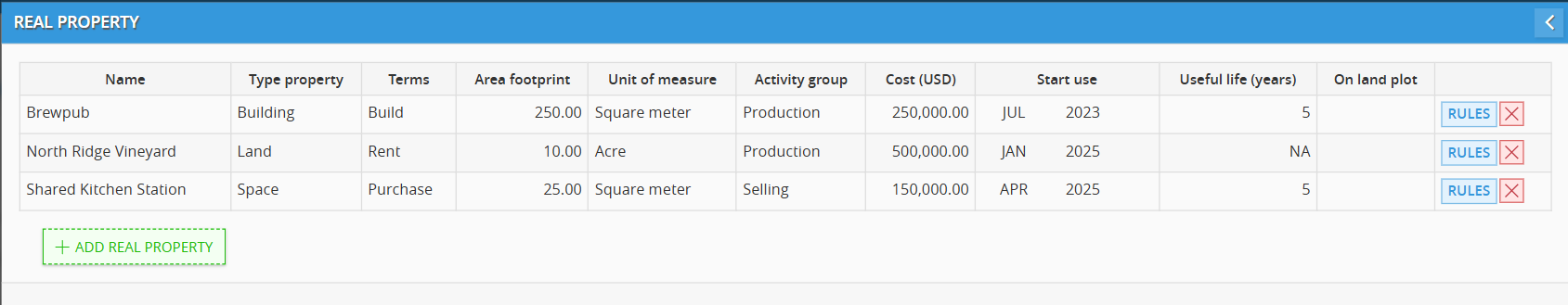 Setting up your Real Property ensures that your model accounts for the physical footprint of your business, including major expenses like rent, mortgage payments, or land acquisition.