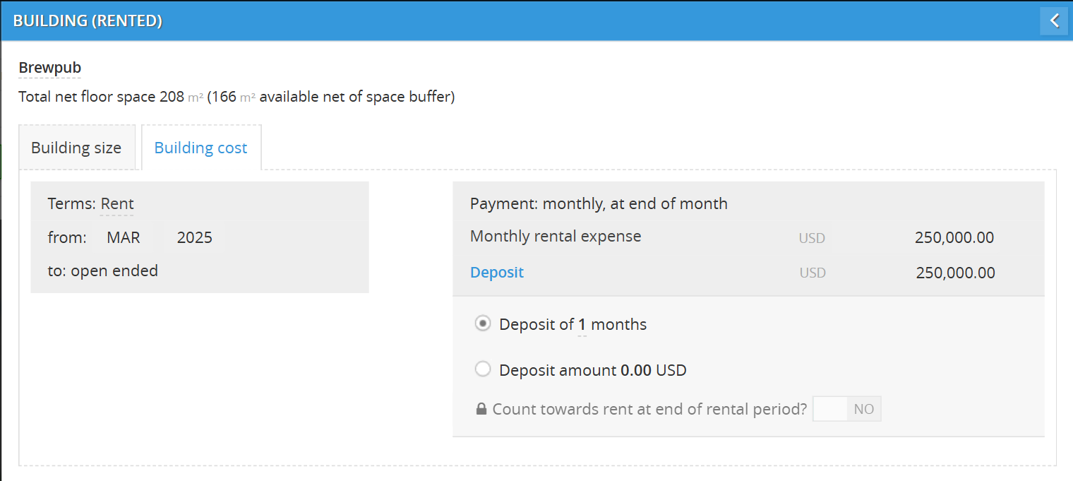 Rent: Set your Monthly rental expense and Lease timeline. If there's an upfront deposit, click Deposit to model that cash outflow.