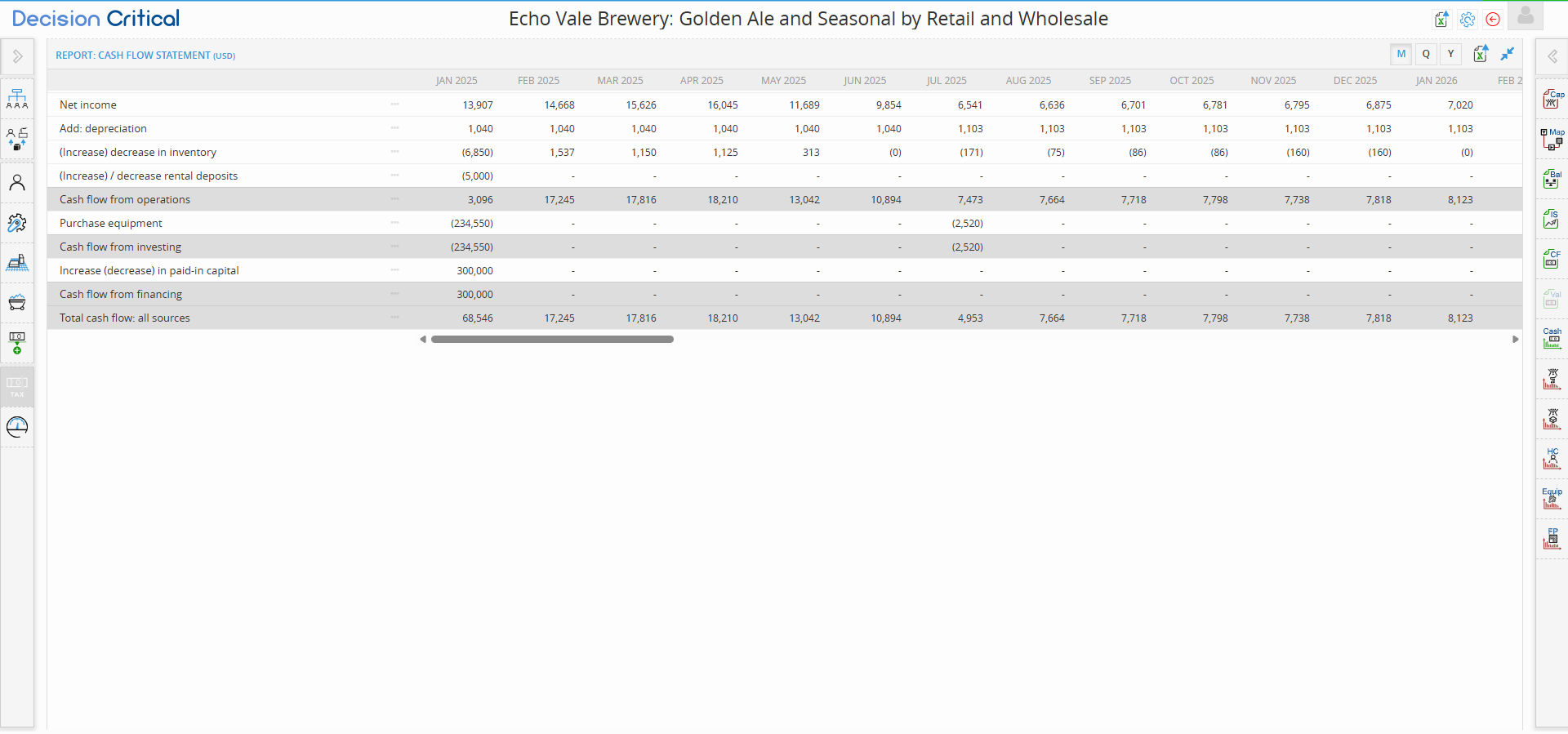 Connecting to Cash Flow: Look back at your Cash Flow Statement. A huge "Purchase Equipment" expense should align exactly with the month your bars first appear or "step up" in this report.