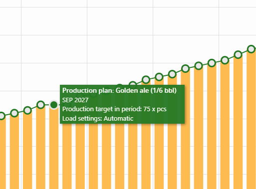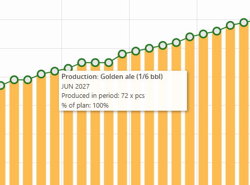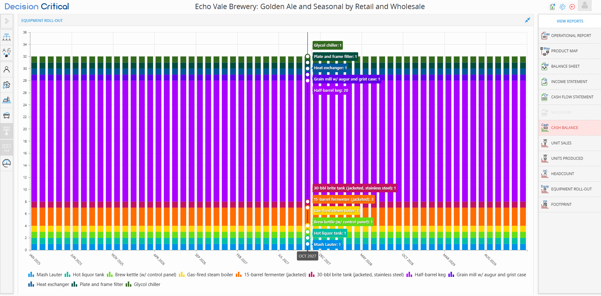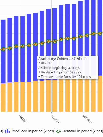 Hovering for Inventory: As you did in image_870709.png, hovering over a bar gives you an instant audit. For example, in Oct 2027, you can see you have 20 Half-barrel kegs and 3 Fermenters.