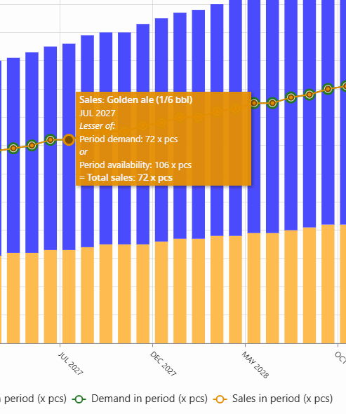 Hover for Tooltips: As seen in your images, hovering over the chart reveals the exact "Lesser-of" calculation for that month (e.g., JUL 2027: Demand (72) vs. Availability (106) = Sales (72)).