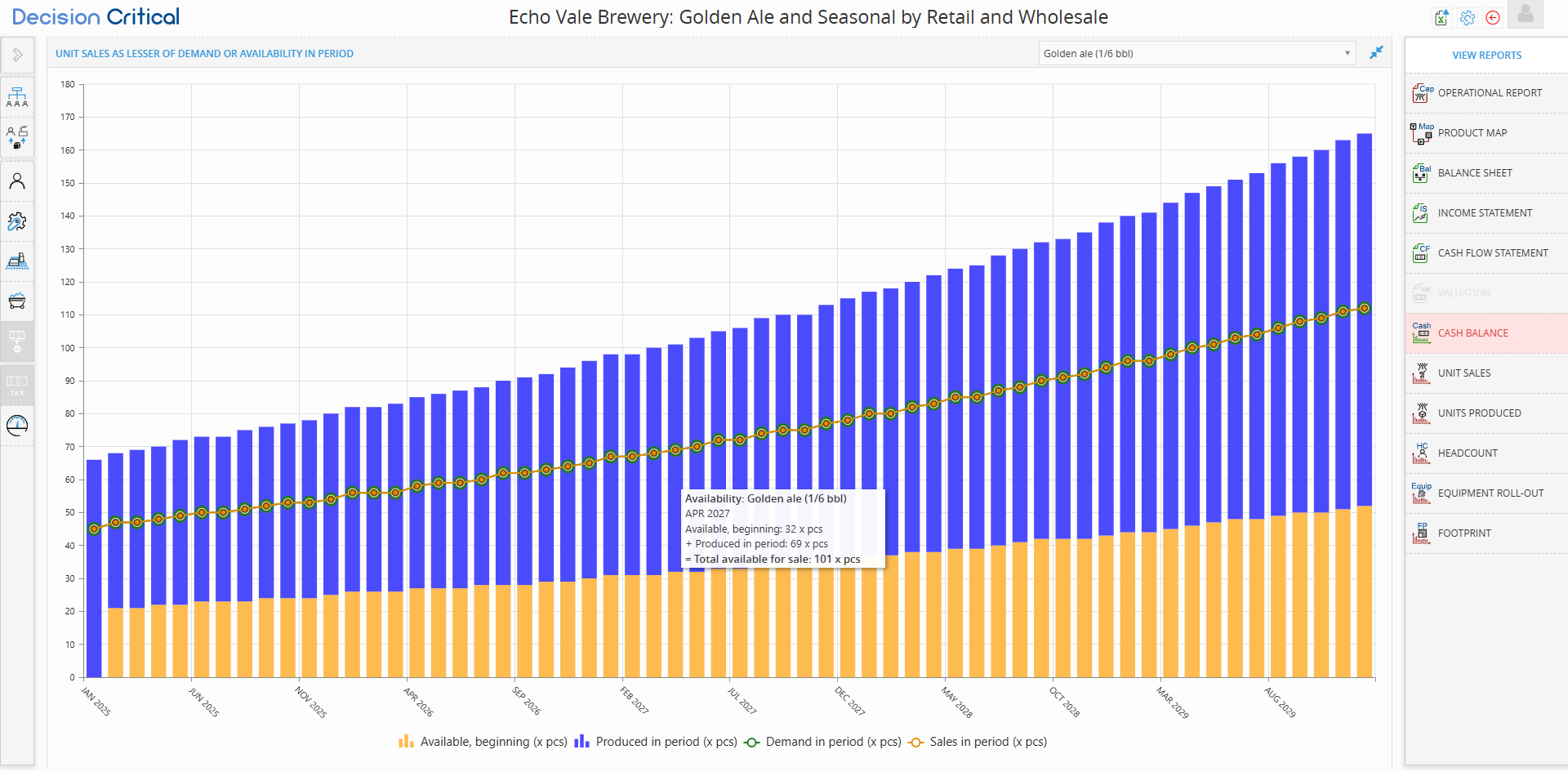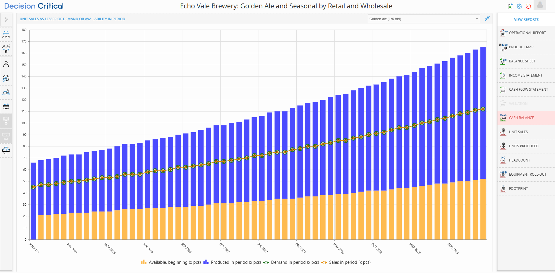 In Decision Critical, the Unit Sales report is a visual "stress test" for your supply chain. It illustrates the fundamental business logic that your actual sales are always the lesser of two things: the amount of product customers want (Demand) or the amount of product you actually have (Availability).